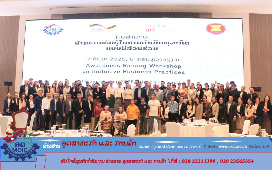 ໃນວັນທີ 17 ກັນຍາ 2025 ຜ່ານມານີ້, ກົມການຄ້າພາຍໃນ, ກະຊວງອຸດສາຫະກຳ ແລະ ການຄ້າ (ອຄ) ໄດ້ຈັດງານສໍາມະນາພາຍໃຕ້ຫົວຂໍ້: “ການຍົກລະດັບຄວາມຮັບຮູ້ແນວທາງໃນການດໍາເນີນທຸລະກິດແບບມີສ່ວນຮ່ວມ ໃນ ສປປ ລາວ (Awareness Raising on Inclusive Business Practice in Laos)” ທີ່ ໂຮງແຮມ ຄລາວພລາຊາ, ນະຄອນຫຼວງວຽງຈັນ, ໂດຍການເປັນປະທານຮ່ວມຂອງ ທ່ານ ສັນຕິສຸກ ພູນສະຫວັດ ຫົວໜ້າກົມການຄ້າພາຍໃນ, ກະຊວງອຸດສາຫະກຳ ແລະ ການຄ້າ ແລະ ທ່ານ ນາງ ມະນີວັນ ກິດຕິລາດ ຮອງຫົວໜ້າກົມນະໂຍບາຍຕໍ່ຜູ້ມີຜົນງານ, ພິທີການ ແລະ ຜູ້ສູງອາຍຸ, ກະຊວງແຮງງານ ແລະ ສະຫວັດດີການສັງຄົມ ຊຶ່ງມີຜູ້ເຂົ້າຮ່ວມທັງໝົດຈາກພາກລັດ ແລະ ທຸລະກິດ ຫຼາຍກວ່າ 200 ຄົນ? ພາຍໃຕ້ການສະໜັບສະໜູນຂອງໂຄງການ GIZ-PROTECT II ຂອງລັດຖະບານເຢຍລະມັນ.